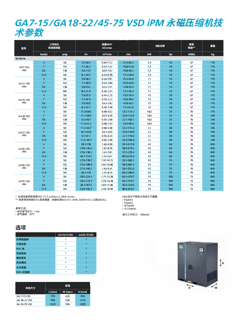 阿特拉斯·科普柯的GA7-15/GA18-22/45-75VSD永磁变频压缩机精巧的驱动和智能控制让其拥有出色的可靠性和效率。该系列是采用了内置永磁电机(iPM)和压缩机专用变频器的变转速驱动压缩机。GA7-15/GA18-22/45-75 VSD比定频机型平均节能35%*,为空压机行业树立了成本节约与稳定性能的新标杆。